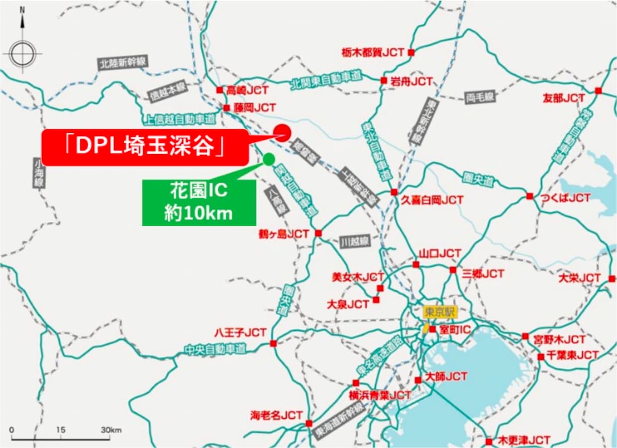 建設地は、1965年に操業を開始した東芝深谷事業所の跡地の一部を活用する。関越自動車道花園インターチェンジから約10キロ、国道17号線から約4キロに位置し、首都圏と北関東を結ぶ広域物流拠点としての利用を見込む。JR高崎線籠原駅から約2.3キロ、深谷駅から約3.1キロと通勤利便性も確保した。