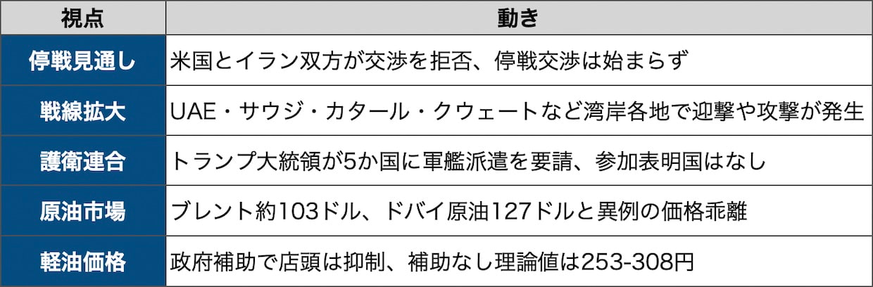 国際ホルムズ危機は3週目に入った。ドナルド・トランプ米大統領は15日、カーグ島を「お楽しみでもう何回か叩くかもしれない」と言い、イランのアッバース・アラグチ外相は「停戦を求めたことも交渉を求めたこともない」と返した。17日目にして双方が交渉を拒む構図が固まり、原油100ドル超の長期化はもはや前提になりつつある。政府は19日から軽油を含む緊急補助金を再開し、店頭価格を抑える構えだが、財源は2か月持つかどうか。補助金で価格が見えにくくなっている今のうちに、物流事業者が動けるかどうかが分かれ目になる。(編集長・赤澤裕介)