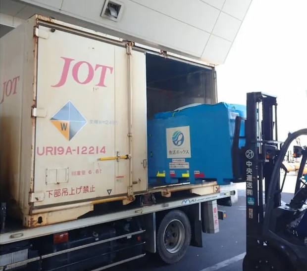 ▲JRコンテナから魚活ボックスをトラックへ載せ替える様子(出所:日建リース工業)