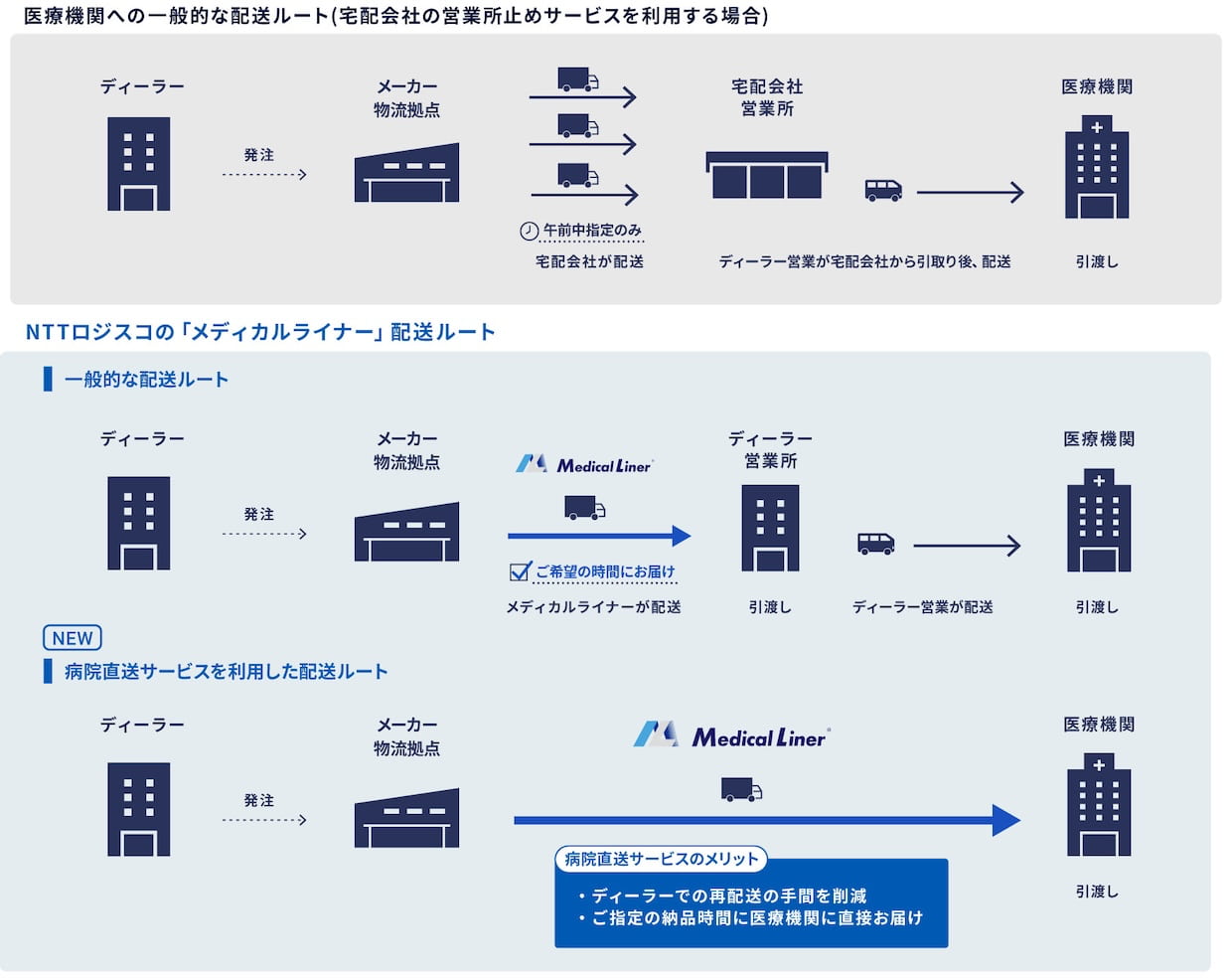 メディカルライナーは、医療機器に特化した共同配送サービスで、専門教育を受けたドライバーが医療機器メーカーの物流拠点から医療機器ディーラーの営業所へ配送する仕組み。従来はディーラーの営業担当者が医療機関へ再配送するケースが一般的だった。