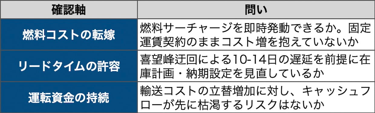 この3軸のどれか1つでも「否」であれば、海峡の再開を待つ余裕はなく、国際情勢より先に自社の契約と資金繰りが限界を迎える。