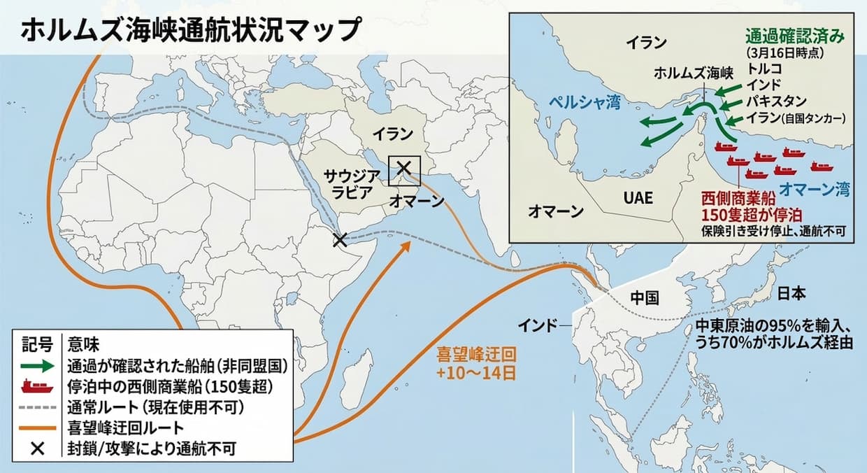 ▲ホルムズ海峡の通航状況(3月17日時点)。非同盟国の船舶(緑)が散発的に通過する一方、西側商業船150隻超(赤)はペルシャ湾外で停泊を続けている。通常ルート(灰色破線)はホルムズ、バブエルマンデブの両海峡で封鎖中(クリックで拡大)