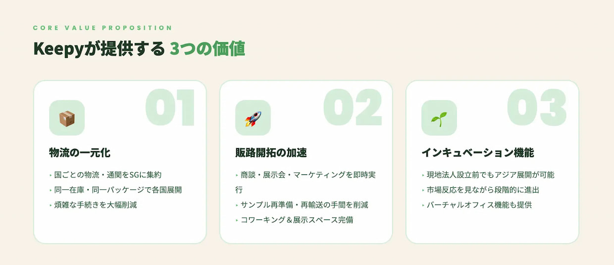サービス・商品日本アシスト(大阪市天王寺区)は17日、シンガポールを起点にアジア市場への進出を目指す日系企業向けに、販路開拓と物流を一体で支援する多拠点型プラットフォームサービス「Keepy」の提供を開始した。