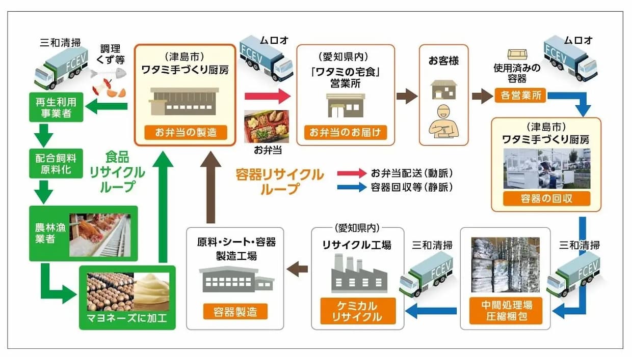 ワタミは愛知県津島市の食品加工工場「ワタミ手づくり厨房 中京センター」で使用電力を100%再生可能エネルギーに切り替え、弁当容器の回収・リサイクルにも取り組んできた。しかし弁当の配送と使用済み容器・調理くずの回収という物流部門だけが脱炭素化できていない課題が残っていた。そこでワタミは、愛知県が募集した脱炭素プロジェクトに自らプロジェクト総括として応募。