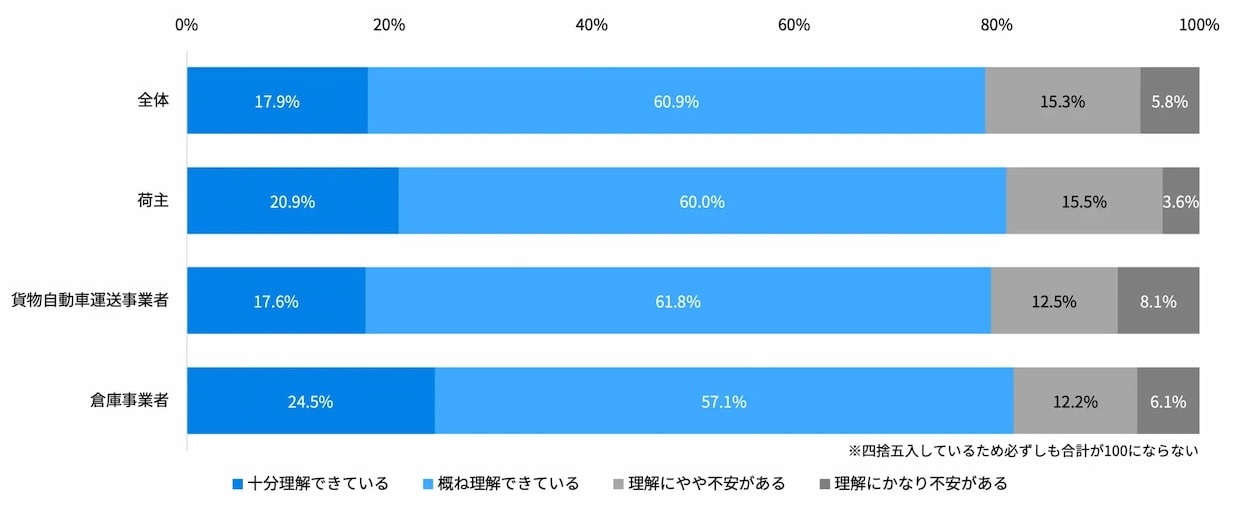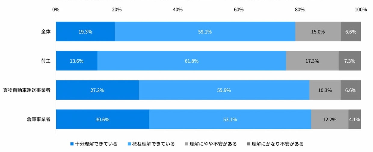 調査によると、物流総合効率化法と貨物自動車運送事業法は約8割、トラック新法も71.2%が「十分・概ね理解できている」と回答した。一方で対応状況については、全体の4割超が不安を感じていると回答し、理解と実務対応の間にギャップがある実態が浮き彫りとなった。