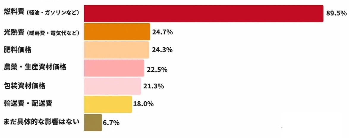 調査結果によると、現時点で生産活動への影響を実感している生産者は66.7%に上り、そのうち21.3%が「大きく影響が出ている」と回答した。影響を受けている項目は燃料費(軽油・ガソリンなど)が89.5%を占め、光熱費が24.7%、肥料価格が24.3%と続く。