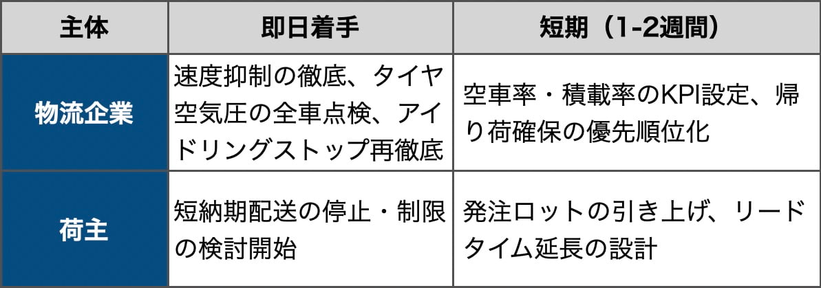 物流企業にとって即日着手できるのは、速度抑制の徹底、タイヤ空気圧の全車点検、アイドリングストップの再徹底だ。デジタルツールの導入はコストと時間がかかるが、空車率と積載率のKPI(重要業績評価指標)を設定し、配車担当者が日次で追う仕組みは今の体制でも始められる。空車走行の削減と帰り荷の確保を最優先に据え直すことだ。