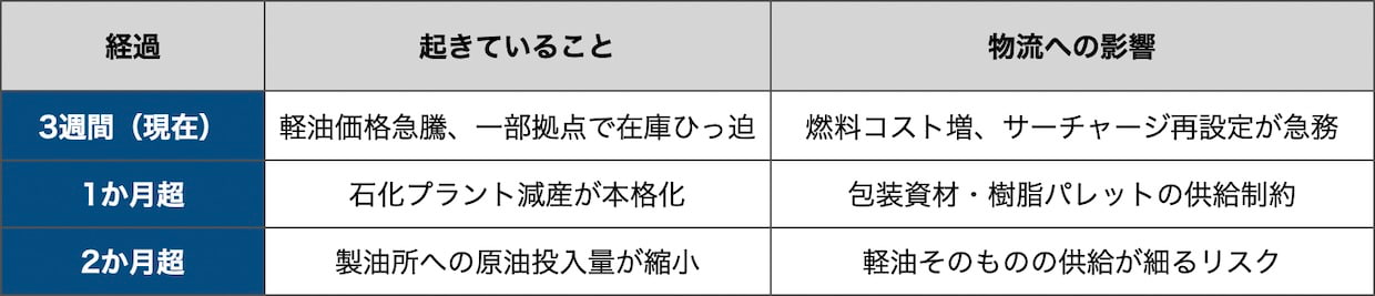 危機の時間軸はこう動く。開戦から3週間が経過した現時点で、軽油価格の急騰と一部拠点での在庫ひっ迫が始まっている。封鎖が1か月を超えれば、本誌が報じた石化プラントの減産が本格化し、包装資材や樹脂パレットの供給制約が物流現場に波及する。2か月を超えれば、備蓄の取り崩しペース次第で製油所への原油投入量が絞られ、軽油そのものの供給が細るリスクが出てくる。需要抑制は「やった方がいい」ではなく「やらなければ物流が止まる」段階に近づいている。