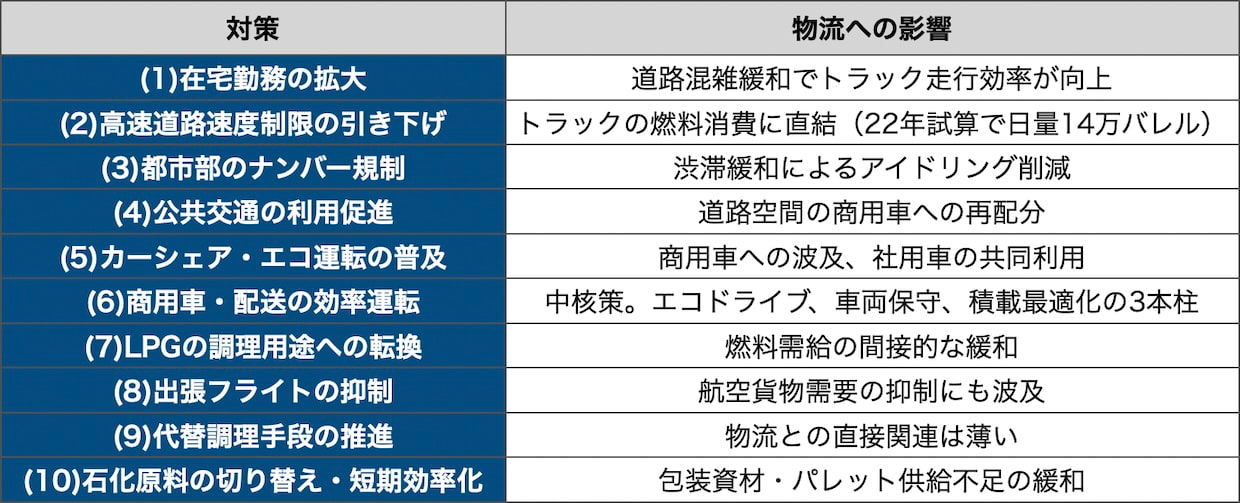 10項目のうち(1)から(6)までの6項目が道路輸送に関わり、(6)が物流に関わる中核的な対策に位置づく。(2)と(6)を合わせれば、22年の試算ベースで日量46万バレルのディーゼル削減に相当する。需要抑制策の中で物流関連が占める比重は極めて大きい。
