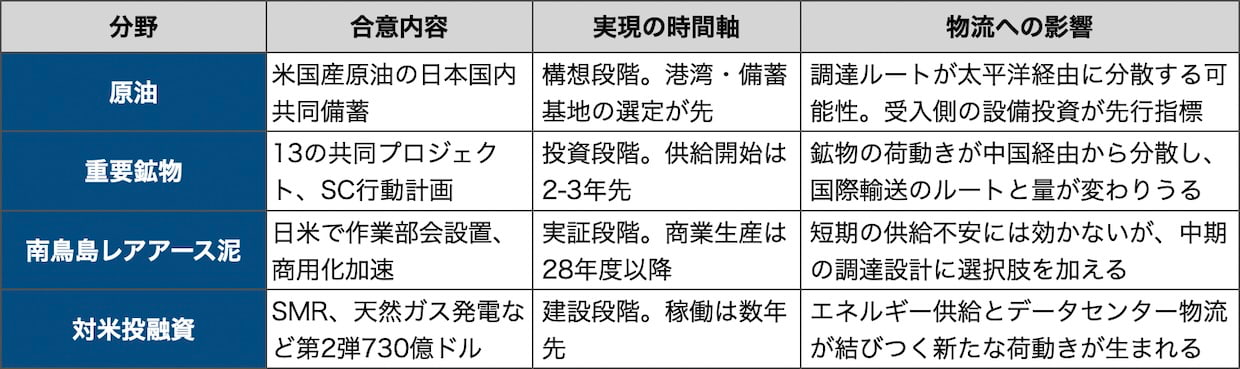 今回の合意は、足元のホルムズ封鎖に伴う燃料コスト上昇や海上輸送の混乱を即座に解消するものではない。原油備蓄は構想段階、鉱物プロジェクトは投資段階、南鳥島は実証段階にある。