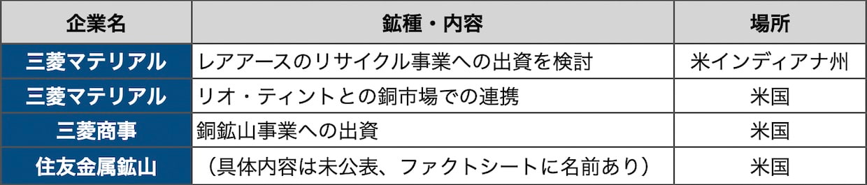 重要鉱物では、日米企業が参画する13の共同プロジェクトが公表された。判明している主な案件は以下の通りだ。