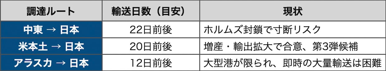 ただし、ルートが増えればコストも増える。備蓄基地の確保、受入港湾の整備、タンカーの手配は短期間では進まない。アラスカには大型タンカーが入れる港が限られるという物理的な制約もある。調達先を分散させることは、在庫管理と輸送のオペレーションが複雑になることと表裏一体だ。