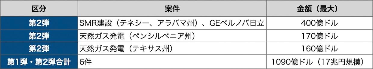 対米投融資は、2月の第1弾(天然ガス発電、原油積み出し港整備、人工ダイヤモンドの3件、計360億ドル)に続き第2弾が発表された。