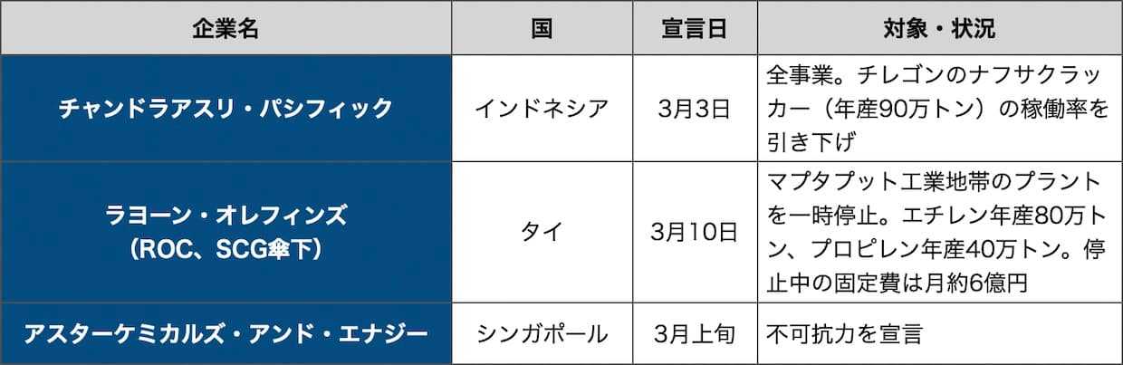 今回の危機で先に動いたのは石化メーカーだった。ナフサクラッカーとは、原油から取り出したナフサ(粗製ガソリン)を高温で分解し、プラスチックや合成ゴムの原料を作る装置だ。ここから出るポリエチレンやポリプロピレンは食品の包装フィルムやペットボトルに、ブタジエンはタイヤや靴底に、スチレンは発泡トレーや家電の外装に使われる。そのナフサがホルムズ経由で届かなくなり、ASEAN域内の石化メーカーが相次いで不可抗力を宣言した。