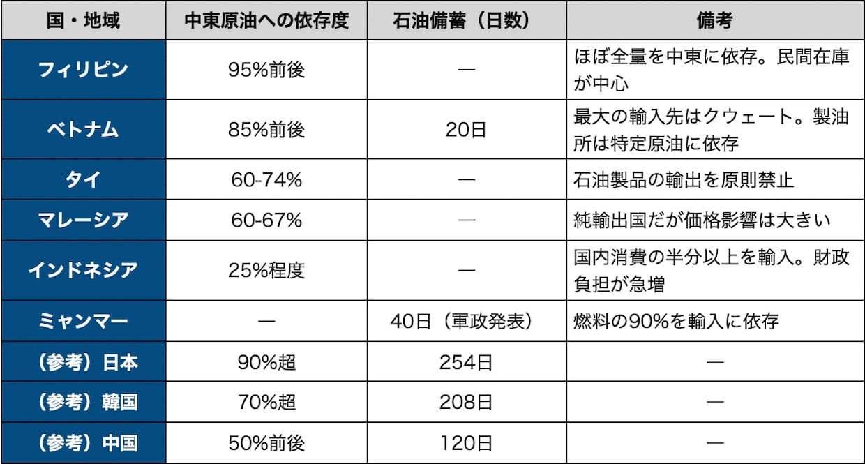 東南アジアの石化産業がこれほど脆いのは、中東産原油への依存度が高く、備蓄が薄いためだ。ASEAN・東アジア経済研究センター(ERIA)のエコノミスト、アロイシウス・ジョコ・プルワント氏のデータをもとに整理する。