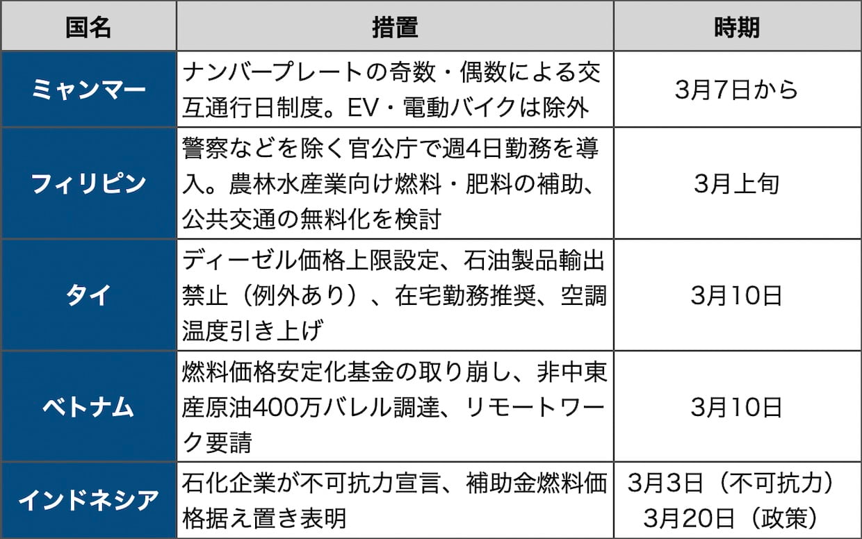 国際ホルムズ海峡の封鎖が3週間を超え、東南アジア各国はエネルギー確保と国内消費の抑制を同時に進めている。官公庁の週4日勤務、交互通行日制度、ディーゼル価格の上限設定、石油製品の輸出禁止と、措置は多岐にわたる。燃料価格の上昇に目が行きがちだが、日本の物流事業者が警戒すべきは石化原料の供給停止だ。プラスチックや包装フィルムの原料となるナフサが届かなくなり、ASEAN域内の石化メーカーが相次いでフォースマジュール(不可抗力)を宣言した。製品は完成しているのに包装材がない、部品はそろっているのに樹脂部品だけが来ない、という形で影響が日本に届く局面に入った。(編集長・赤澤裕介)