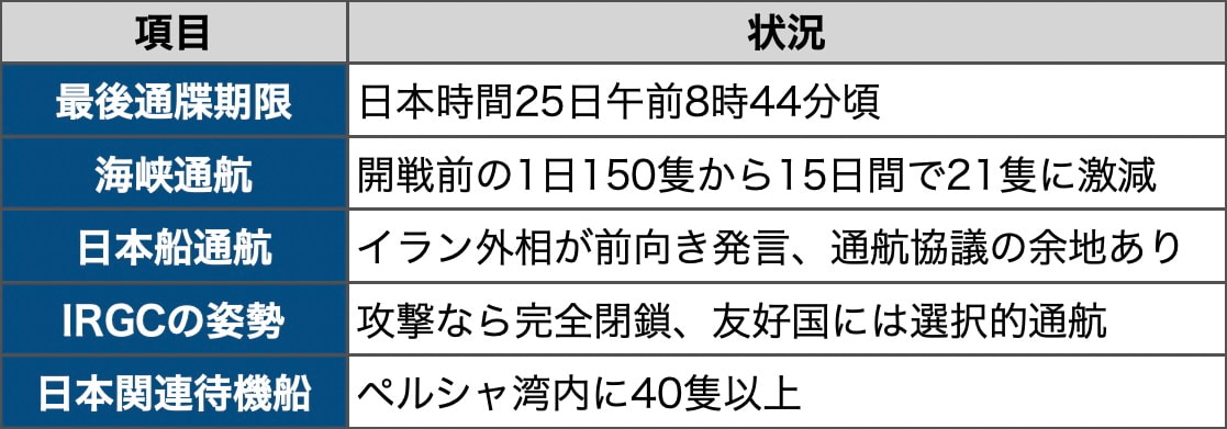 イラン軍が完全閉鎖に転じれば、日本向けの交渉も白紙に戻る。