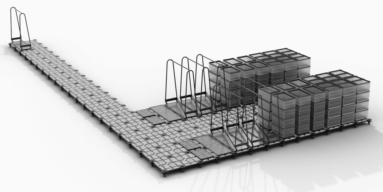 搬送の中核を担うのはタイルと呼ばれるリニアモーター駆動の床面、走行路部分である。ラックを載せた台車自体にはモーターもバッテリーもないため、故障リスクなくシンプルな運用を実現する。