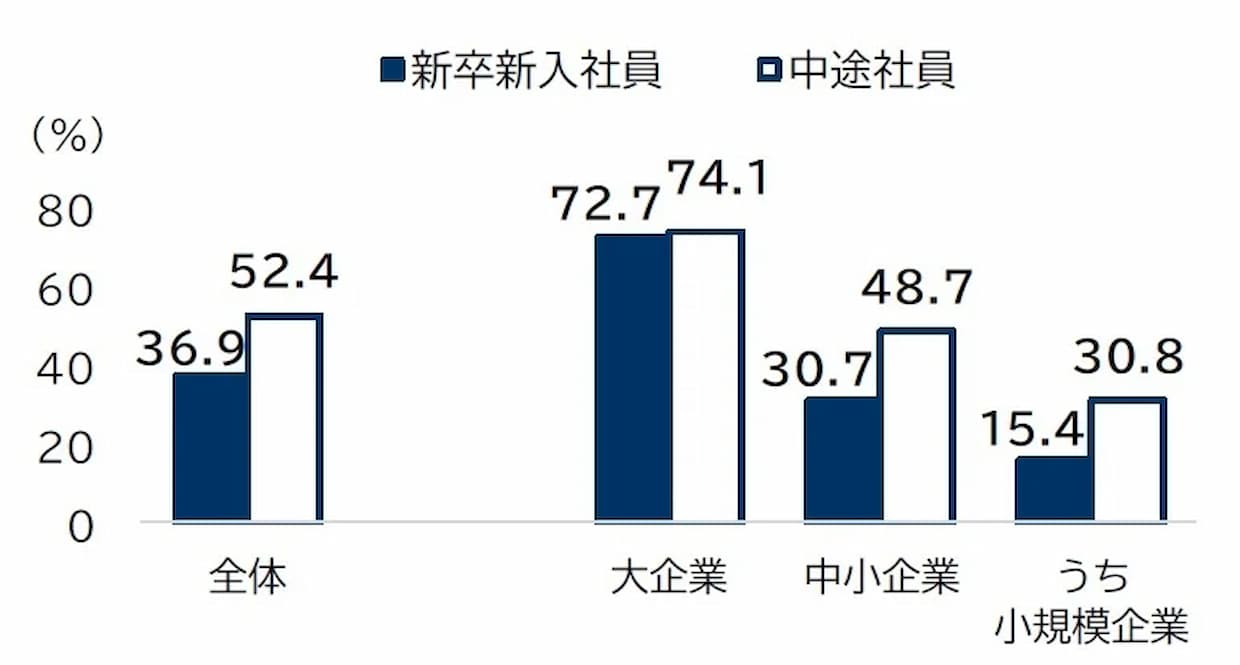 採用形態では、中途採用が52.4%と新卒採用の36.9%を上回り、特に中小企業で中途採用への依存が強い傾向がみられた。一方、非正社員で「採用予定がある」企業は41.2%と3年連続で低下した。