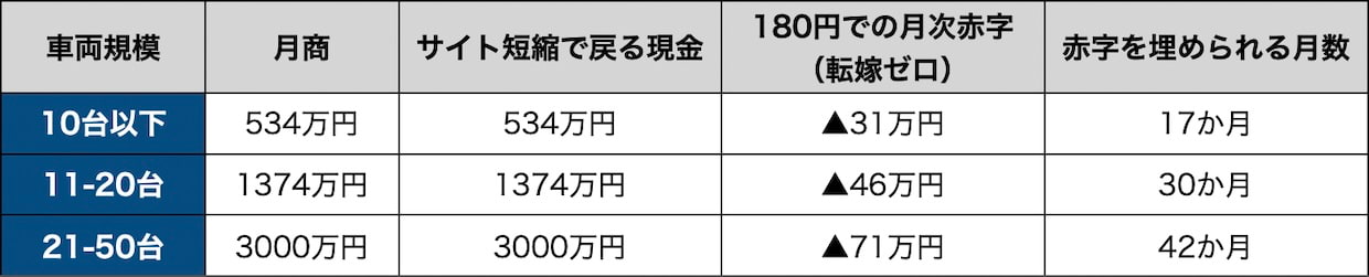 ・今回の試算の土台となった規模別シミュレーション。20台以下が危機前から赤字だった事実、軽油180円で50台以下が赤字圏に入る構造、「あと何か月持つか」の計算方法を掲載している。