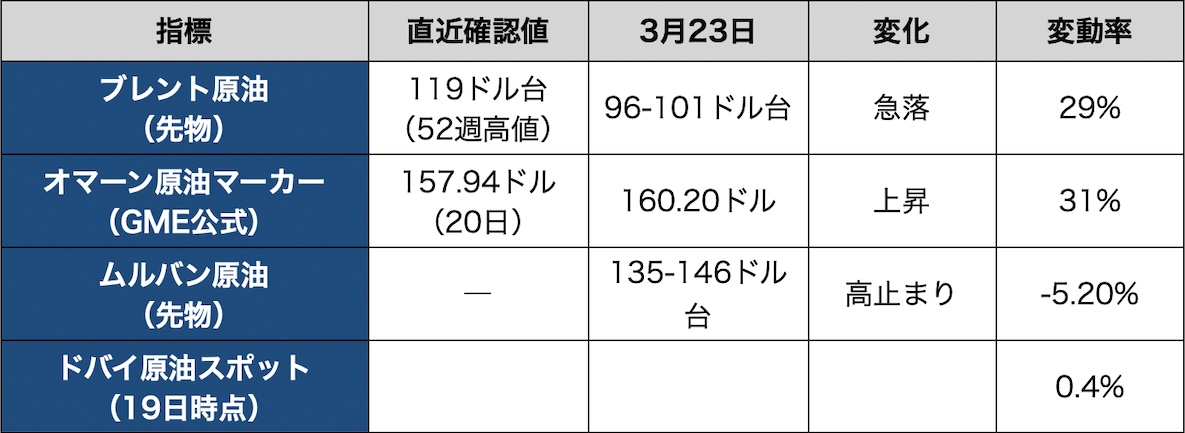 まず起点の原油。日本は原油輸入の9割超を中東に依存しており、価格の基準はブレントではなくドバイ原油(プラッツMOC)とオマーン原油(GME公式OQDマーカー)だ。23日の値動きがこの違いを鮮明にした。