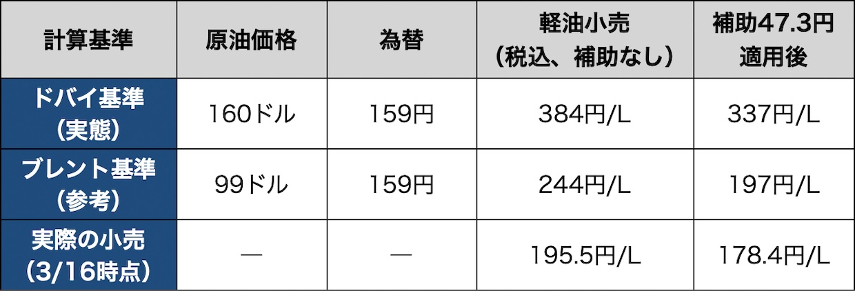 理論値ベースでドバイ基準の384円とブレント基準の244円の差は140円になる。ブレント急落を見て「軽油が下がる」と考える場合、この140円分の認識のズレが生じうる。さらに16日時点の補助なし小売価格195.5円とドバイ基準の理論値384円には189円の開きがある。実際にはこの全額が店頭に転嫁されるわけではなく、補助金や元売りの在庫評価、需給調整で一部は吸収される。それでも補助金47.3円だけでカバーできる規模ではなく、今後3-6週間かけて段階的に価格へ波及していく可能性が高い。