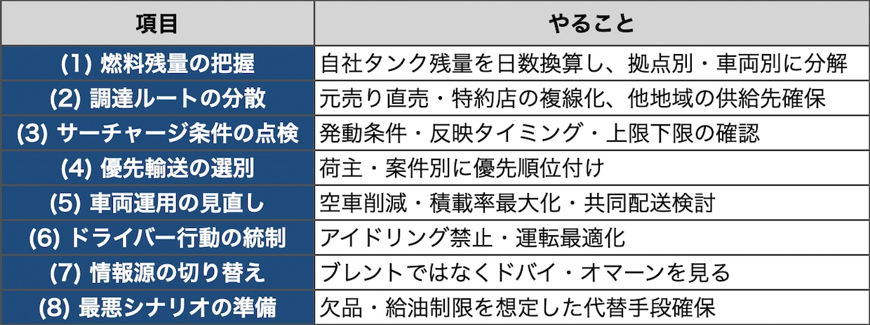 (8)の最悪シナリオとは、軽油が買えない状態だ。ホルムズ海峡の通航制約が長引けば、地域的な欠品や給油制限が現実になりうる。その場合に備えて、鉄道や内航船による代替輸送の可能性を今の段階で調べておく。顧客への事前通知も早いほうがよい。契約上の免責条件(不可抗力条項)がどうなっているかも、起きてからでは確認が間に合わない。