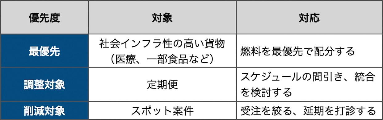 供給がひっ迫した局面では、(4)のように「全部運ぶ」という前提そのものを見直す判断が求められる。止められない貨物とそうでない貨物を分け、限られた燃料で何を優先するかを決める。