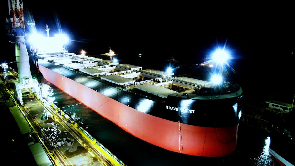 ▲ばら積み貨物船KAMSARMAX「BRAVE QUEST」の進水(出所:常石造船)