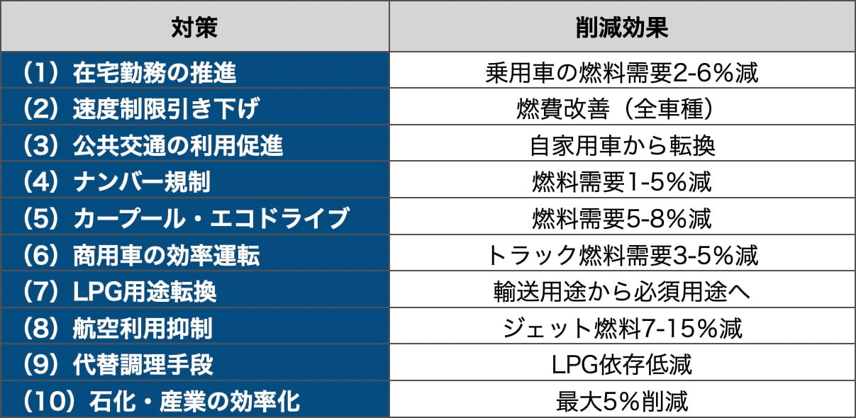 各国の措置を俯瞰すると、明確なパターンが浮かぶ。輸入依存度の高い新興国はQRコード管理、数量上限、ナンバープレート規制といった直接的な配給に踏み切り、先進国や中間国は価格キャップ、補助金、税の軽減を主軸とする。その上に需要抑制策として週4日勤務、在宅勤務、学校の短縮や休校、速度制限、公共交通の運賃割引、非必須照明の削減、エアコンの温度制限が世界的に重なる構図だ。IEAが20日公表の報告書「シェルタリング・フロム・オイルショックス」で推奨する即時対策10項目は以下の通りだ。