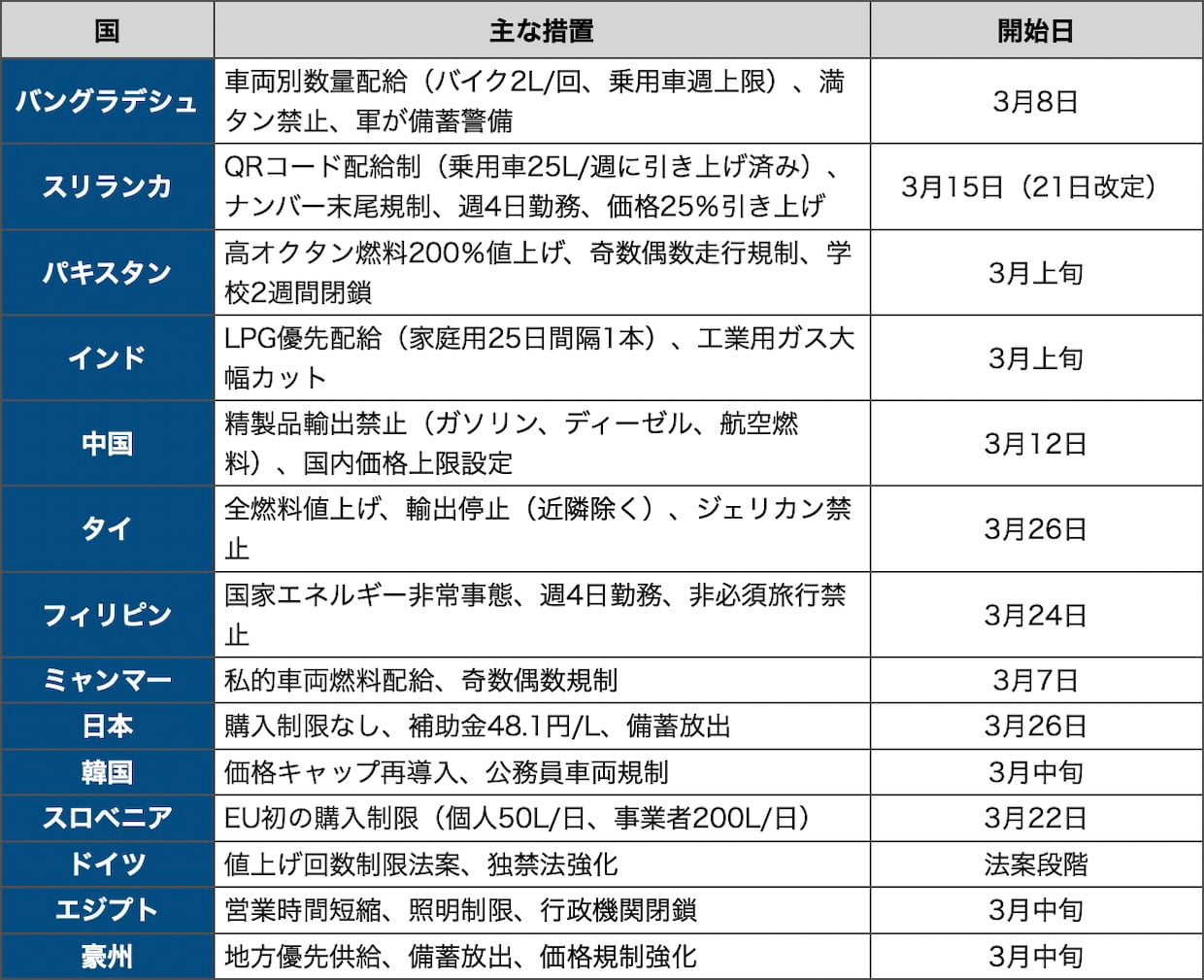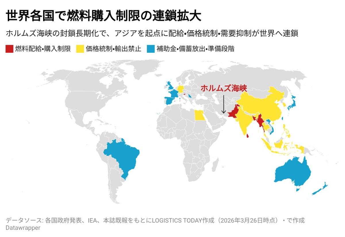 国際ホルムズ海峡の事実上の封鎖が長期化するなか、アジアの新興国を起点に燃料の購入制限や配給制が世界へ波及している。バングラデシュやスリランカではQRコードによる数量管理が本格化し、欧州でもスロベニアがEU加盟国として初めて全国規模の購入上限を導入した。IEA(国際エネルギー機関)は史上最大となる4億バレル規模の備蓄協調放出を進める一方、速度制限や在宅勤務の推進など需要側の即時対策10項目を各国に強く求めている。3月25-26日時点の各国措置を地域別に整理する。(編集長・赤澤裕介)