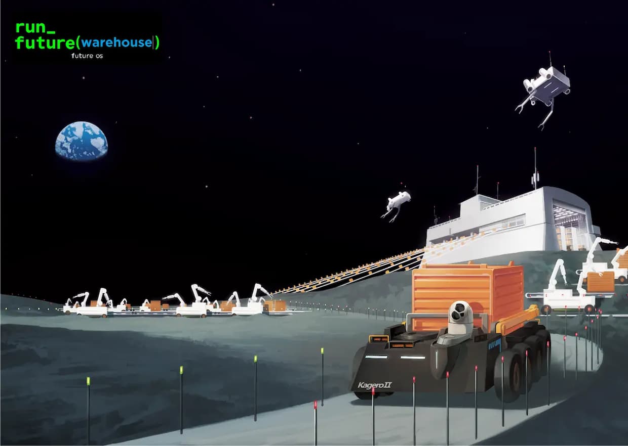 同作品は、複数のロボットや機器を協調制御するFMS(フリートマネジメントシステム)の技術を、月面のスマート物流拠点という設定で表現したもの。自律走行ロボット(AMR)やアームなどが連携し、倉庫業務を自律的に遂行する未来像を描いている。作品は、先端技術の思想やビジョンを可視化するプロジェクト「run_future」の一環として制作された。