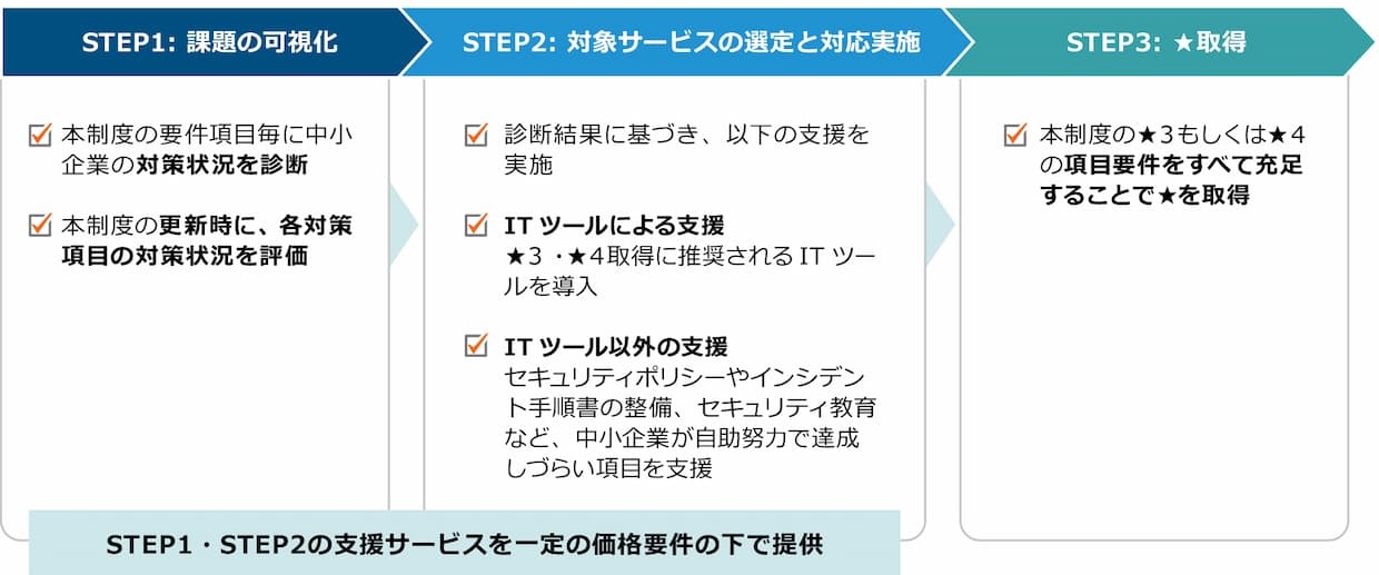 制度では、セキュリティー対策を★3と★4の段階に区分し、★3を基礎要件、★4をより高度な対策水準として位置付ける。企業は自己評価や第三者評価を通じて対策状況を示し、発注企業は取引条件として求める水準を提示する運用を想定する。なお、格付けのような優劣評価ではなく、あくまで対策状況の「見える化」に主眼を置く。