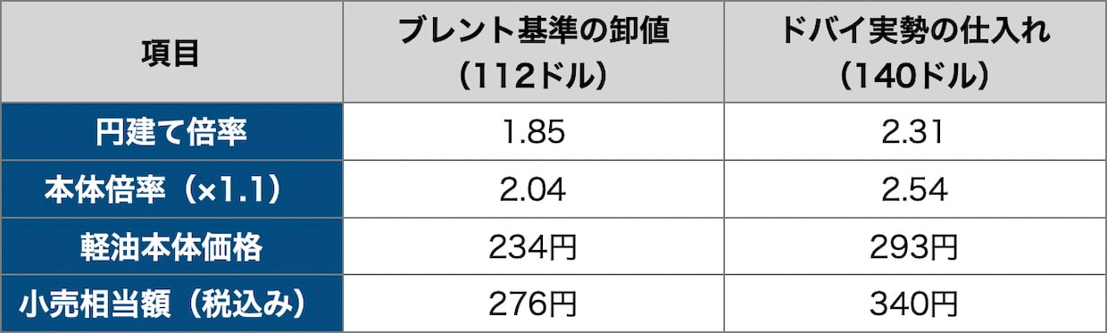ブレント基準で元売りが設定する卸値の小売相当額は276円。しかし元売りの仕入れ原価はドバイ実勢で340円だ。1リットルあたり64円の逆ざやが元売りに生じる。同文書が示す調達コストの上限(200ドル)で計算すればこの逆ざやはさらに膨らむ。補助金で物流事業者の購入価格は170円に抑えられるが、一方で元売りが64円分を吸収している。