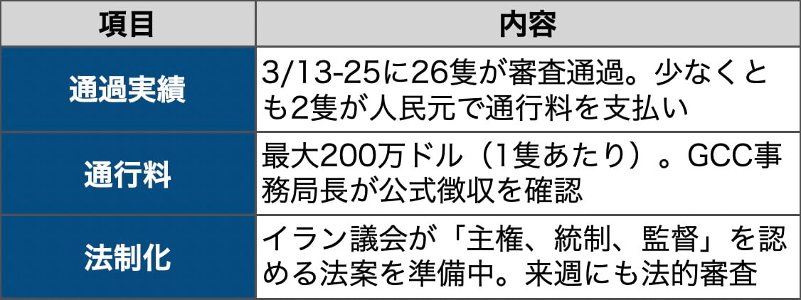この体制はすでに実績を伴っている。26隻が通過し、複数の船舶が通行料を支払ったとされる。湾岸協力会議(GCC)のジャセム・アルブダイウィ事務局長は26日の記者会見で、イランが通行料徴収を公式に行っていると述べた。イラン議会では市民委員会が海峡での「主権、統制、監督」を制度として認め、通行料収入を組み込む法案の準備が進んでいる。イラン議員はイラン国営メディアに「我々は安全を提供している。船舶が通行料を払うのは当然だ」と述べた。