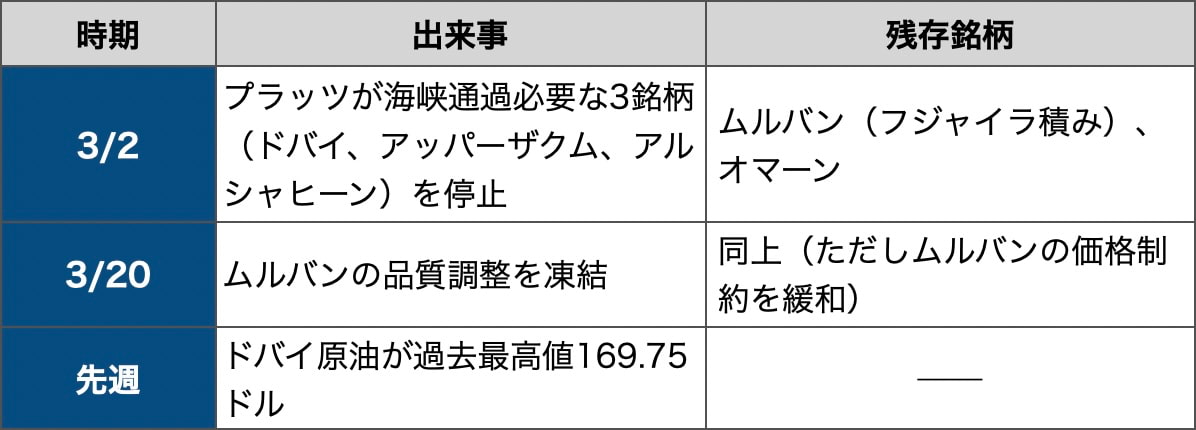 3月2日、プラッツはホルムズ海峡を通過しなければ積み出しできない3銘柄──ドバイ、アッパーザクム、アルシャヒーン──の受け渡しを停止した。海峡封鎖で物理的に運べない原油を、価格指標に残すことはできないという判断だ。残ったのはフジャイラ積みのアブダビ産ムルバンと、オマーン産の2銘柄のみ。さらに20日にはムルバンの品質調整(ドバイ指標に対する割引)も凍結し、取引可能な原油量を最大化する措置に踏み切った。