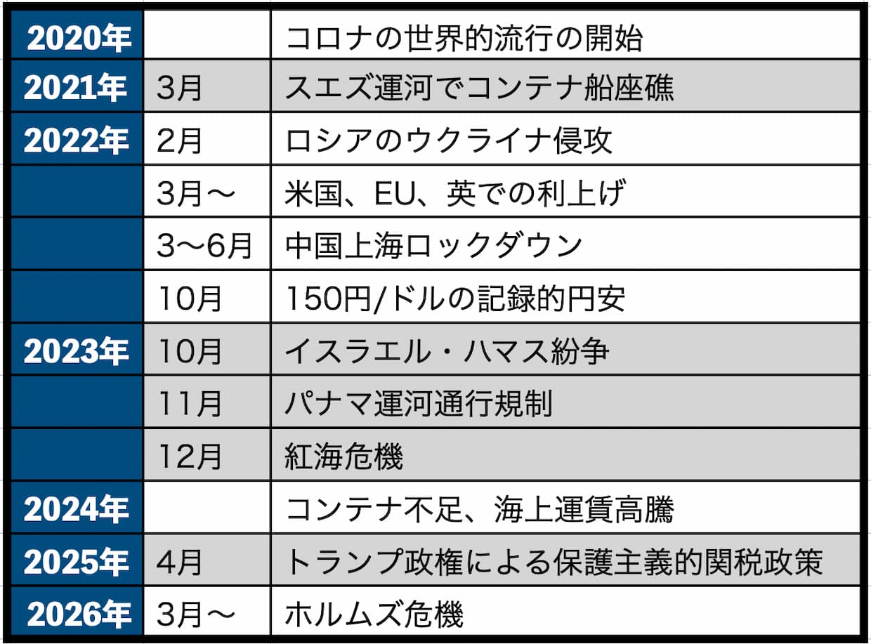 赤澤: 一つ一つの事象を単独で見るのではなく、この三つが同時に回っているということですね。過去を振り返っても、コロナ、スエズ運河の座礁、ウクライナ侵攻、上海ロックダウン、紅海危機、トランプ関税、そして今回のホルムズと、2020年以降だけで有事が常態化しています。今回はこれまでの危機と何が違いますか。