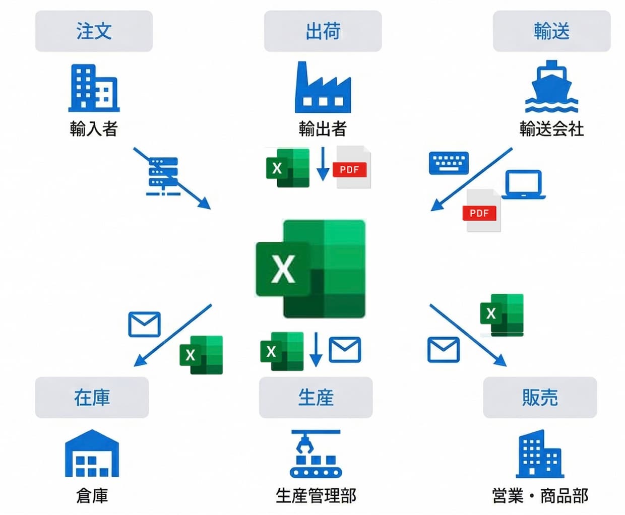 具体的に何が起きているかというと、どれだけ発注したかに対してどれだけ出荷されたかをエクセルで管理し、いついくつどこに届くかということを、通関書類やインボイスを目で見ながら、これはうちの発注商品のこれに当たるから今回は何ケースで、と手書きで書き写す。船会社のホームページに行ってB/L(船荷証券)番号やコンテナ番号を打ち込んでスケジュールを確認し、そのスケジュールをまたエクセルに書き込む。さらにそれを倉庫向け、通関業者向け、営業部向けと、相手に合わせて作り直して共有する。