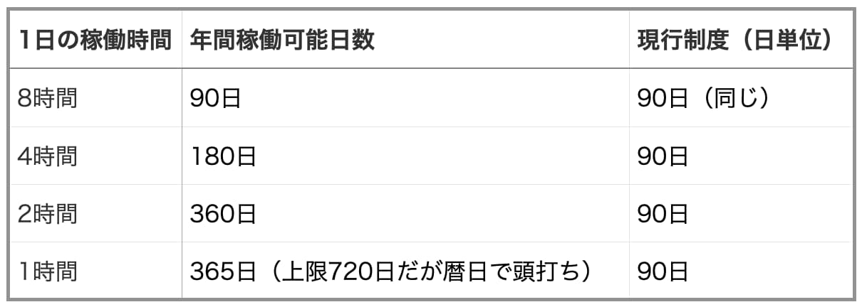事業用車1台分の枠(720時間)を1台の自家用車に集中投入した場合の稼働日数は、1日あたりの稼働時間で大きく変わる。