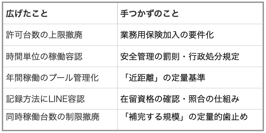 パブリックコメントでは制度の歯止めの弱さを指摘する声が相次いだが、多くは制度に反映されなかった。事故時に個人の保険が適用されないリスクを踏まえ、対人・対物無制限の業務用保険への加入を必須要件とすべきとの意見があったが、保険加入は要件に入っていない。留学生や家族滞在など在留資格ごとの就労制限をシステム上で照合し、不法就労の温床にならないようにすべきとの指摘もあったが、在留資格の確認や抜き打ち監査の仕組みは設けられていない。制度が広げた供給の間口に対し、安全と適法性の統制はほぼ手つかずのまま残っている。