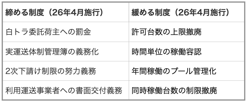 さらに見過ごせないのは、同じ4月に白トラ規制の強化と白ナンバーの有償活用拡大が同時に動く事実だ。トラック適正化2法は、白トラと知りながら発注した荷主にも罰金を科す規定を設けた。無許可の有償運送を根絶するという法律の意志は明確だ。ところが同じ月に、白ナンバー車の有償運送の台数制限を撤廃し、時間単位での稼働を認める通達が施行される。白トラを取り締まる法律と、白ナンバーの有償活用を拡大する通達が同時に走る。許可を得たトラック事業者の管理下という条件はつくが、「白トラはダメだが制度的な間口は広げる」という構図を現場のトラック運送事業者がどう受け止めるかは想像に難くない。
