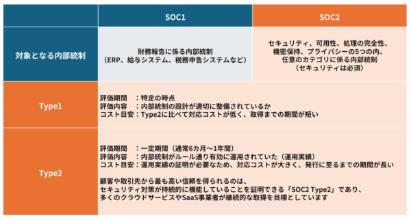 SOC2にはType1とType2がある。Type1は特定時点での設計の適切性を見る。Type2は一定期間にわたって統制が継続的に運用されているかまで検証する。