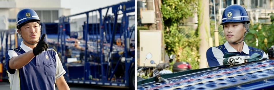 現場で活躍するのは、トレーラー乗務員の田地川ドライバーと、2台積みキャリアカーを操る脇ドライバーだ。田地川氏は専門学校で上級メカニック資格を取得後、トヨタ系ディーラーで5年間整備の腕を磨いた。一方の脇氏はスーパーの店長や酒屋の配達など、接客と管理の最前線を歩んできた。