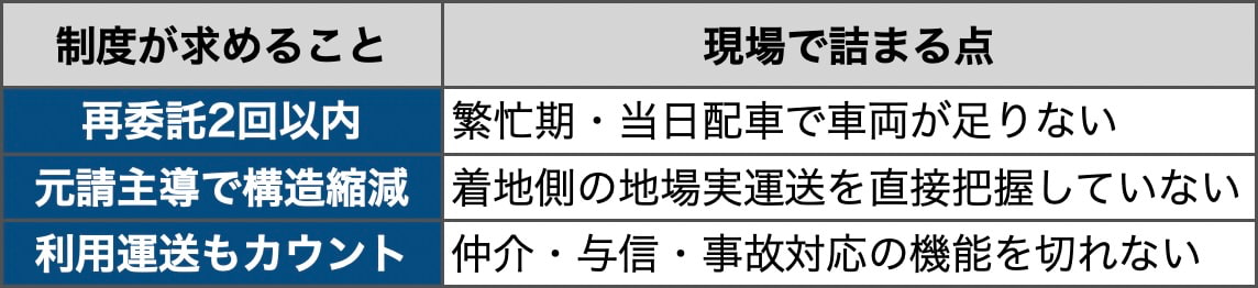 もちろん、すべての取引が3次請け以降に及んでいるわけではない。専属便や定期幹線のように、元請けと実運送の関係が固定化している領域では、2回以内に収まりやすい取引もある。問題は、波動が大きく、着地側の実運送網を元請けが直接持たない案件ほど、制度との衝突が起きやすいことだ。