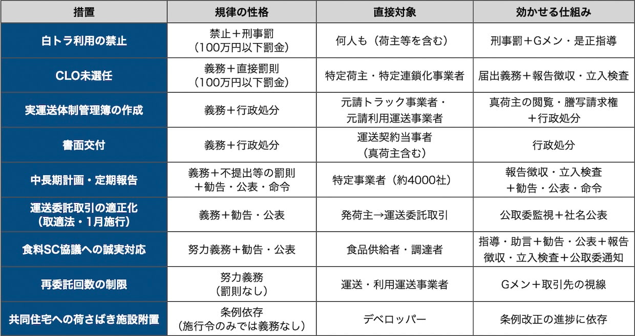 ロジスティクス4月1日、物流に関する複数の制度が同時に動き出した。CLO(物流統括管理者)選任、管理簿、白トラ規制、書面交付、食品サプライチェーンのコスト協議、マンション荷さばき。これに1月施行の取適法が加わる。個別に見れば別々のテーマだ。だが制度を横断して見ると、共通する方向が浮かぶ。中心制度群では、改善の有無だけでなく、説明可能な状態が求められ始めた。「取り組んでください」から「計画し、測定し、説明できる状態を作れ」へ。本稿ではこの転換を「管理義務」と呼ぶ。すべての制度を同じ強度で説明する言葉ではない。制度の重心が移った方向を指す。(編集長・赤澤裕介)