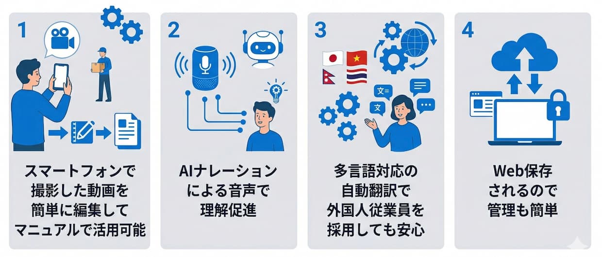 例えば、作業の手順を動画で撮影し、それに多言語の字幕や解説をつけて配信する。動画を見た後にテストを行い、合格しなければ次のステップに進めないといった細かな学習フローも管理可能だ。これにより、通訳が常駐していなくても、外国人材が安全かつ正確に業務を習得できる環境を整えることができる。