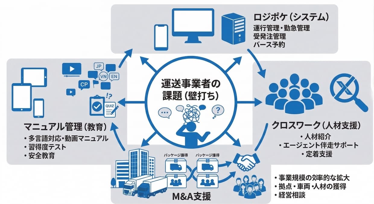 労務管理から勤怠、受発注管理、教育までを網羅した「ロジポケ」をはじめ、教育を補完する「マニュアル管理」、人材支援の「クロスワーク」、そして企業や組織のあり方に関わる「M&A」など、運送業のあらゆるシーンに対応できるサービス群を用意しているのがX Mileの最大の特徴であり強みでもある。一見すると独立したサービスに見えるが、現場の課題は常に複雑に絡み合っている。同社の真の価値は、それらを面で捉え、ワンストップで解決策を提示できることだ。