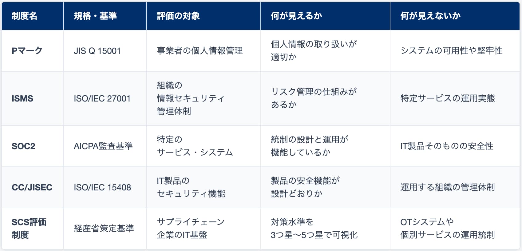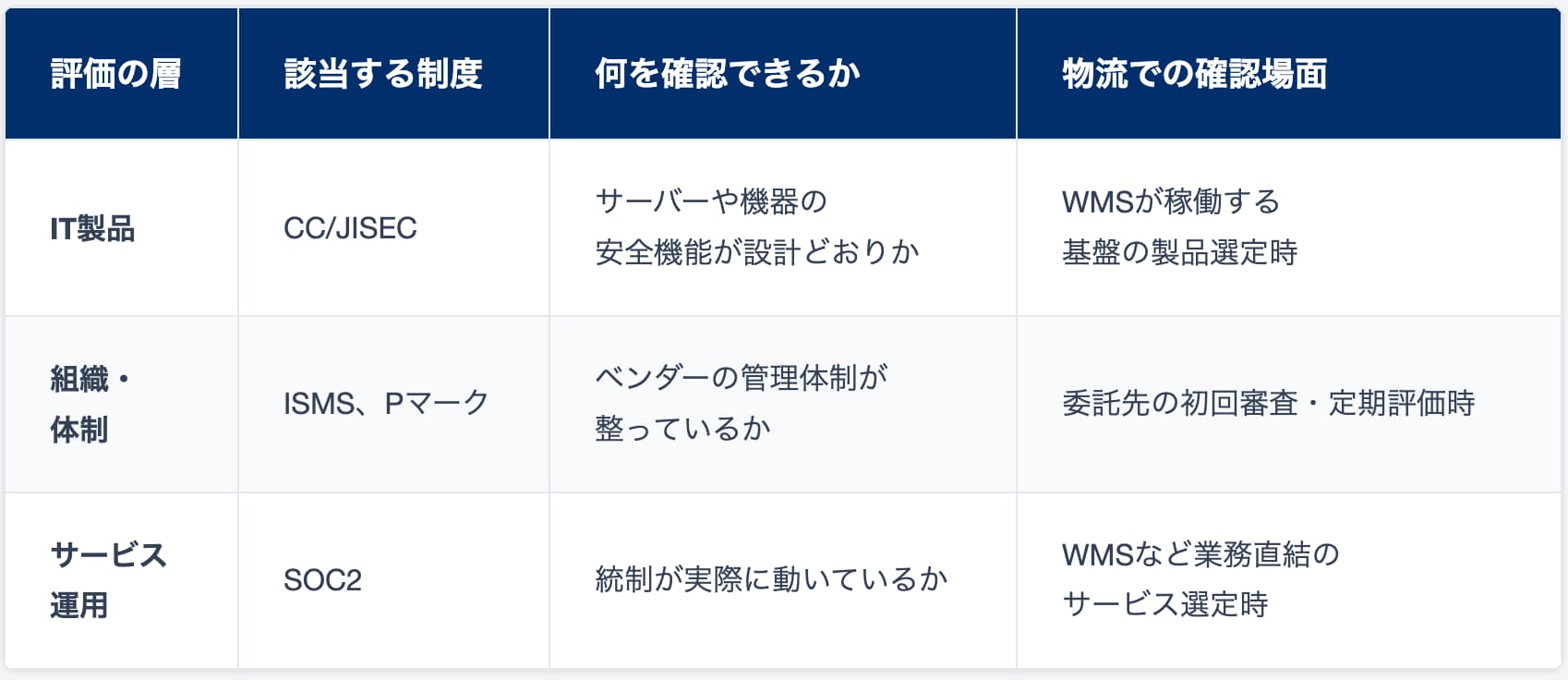 だが、この新制度も万能ではない。SCS評価制度の対象はサプライチェーン企業のIT基盤(クラウド環境を含む)であり、OTシステム(工場の制御システムなど)は範囲外だ。IT基盤全体の対策水準は測れても、WMSのような個別サービスの運用統制が実際に機能しているかまでは踏み込まない。WMSの安全性を見るには、SOC2やCC/JISECなど別の制度を組み合わせるしかない。経産省自身もISMSとの「相互補完的な発展」を想定している。新しい制度ができたから安心だ、とはならない。