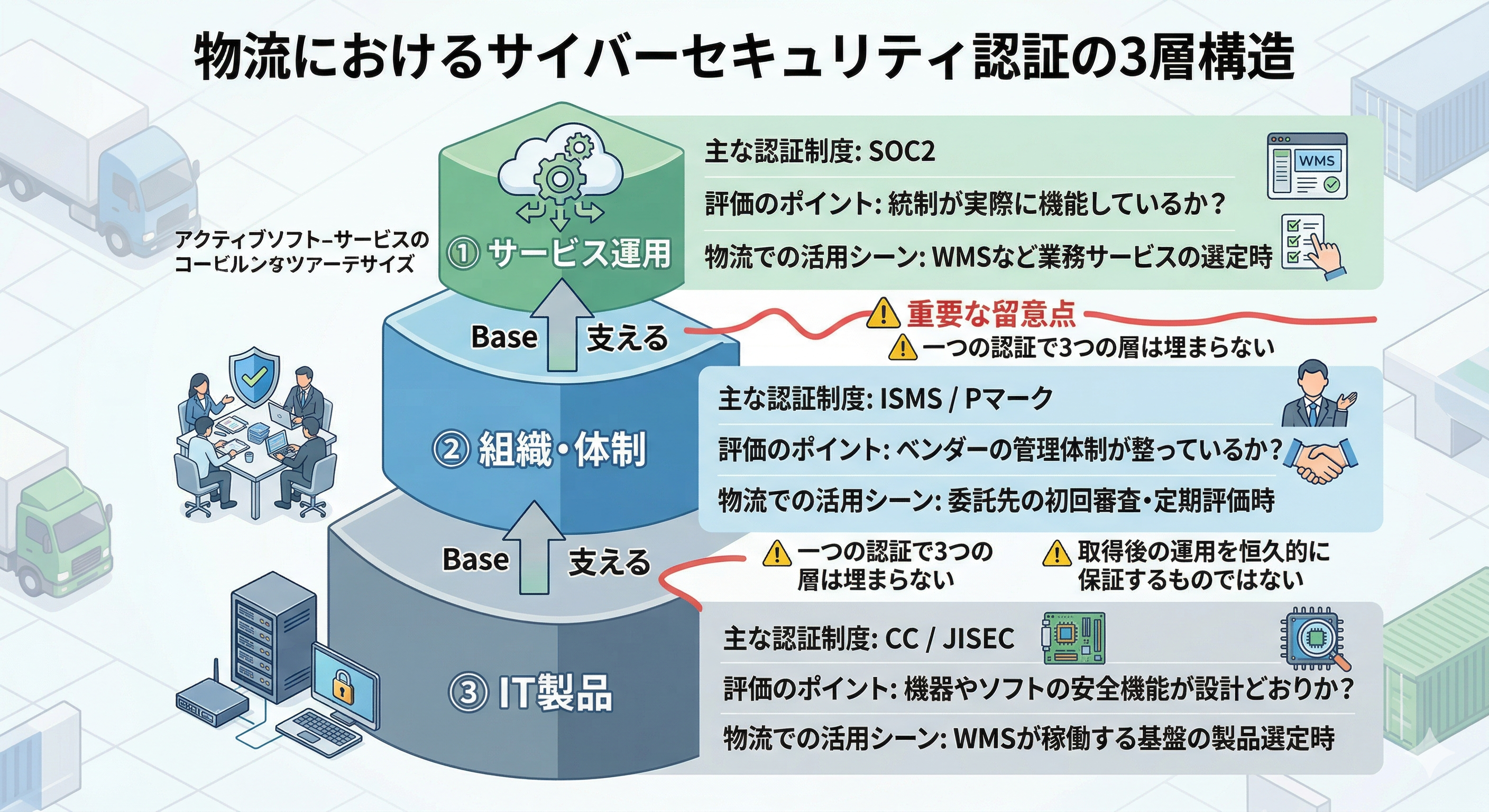 認証制度にはそれぞれ評価の対象と範囲がある。個人情報の管理だけを見るもの、組織の体制だけを見るもの、特定サービスの運用実態を第三者が検証するもの、IT製品の安全機能を評価するもの。一つの認証が全てをカバーすることはない。制度の違いを知らずにWMS(倉庫管理システム)やシステムの委託先を選べば、認証で保証されていない領域のリスクを見落としたまま契約することになる。