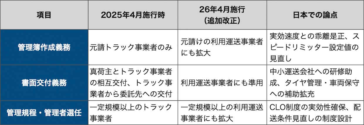 25年4月施行で管理簿と書面交付の基本枠組みは始まっていた。ただし当時の国交省Q&Aでは、管理簿の作成主体は「真荷主から貨物の運送を引き受けた貨物自動車運送事業者」と整理されており、利用運送事業者は対象外だった。その後の追加改正で利用運送事業者にも準用が拡大され、26年4月1日に施行された。
